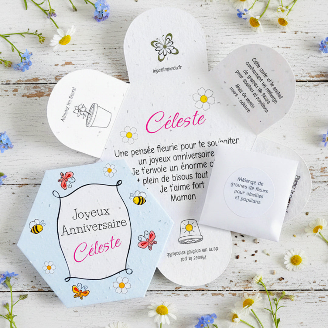 All our products are made from plantable seed paper, recycled paper embedded with wildlife friendly flower seeds. Once planted they will bloom into a lovely selection of flowers.