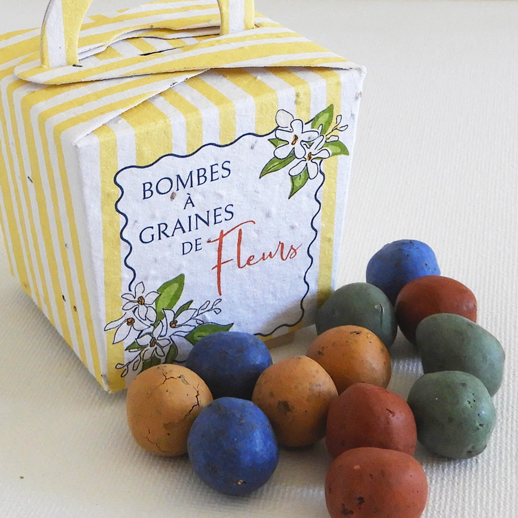 The seed bombs contain a mix of nectar rich flower seeds; Nielle des blés, Alyssum, Myosotis, Matricaria chamomilla, Bleuet, Chrysanthème des moissons, Vipérine commun, Gilia, Gypsophilia elegans, Ibéris amer, Lin cultivé, Lotier, Giroflée des dunes, Giroflée odorante, Nemophila, Onagre à sépales rouges, Coquelicot.